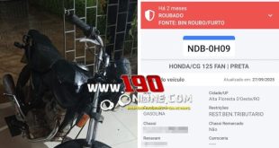 Motocicleta furtada é recuperada pela Polícia Militar em Alta Floresta d’Oeste