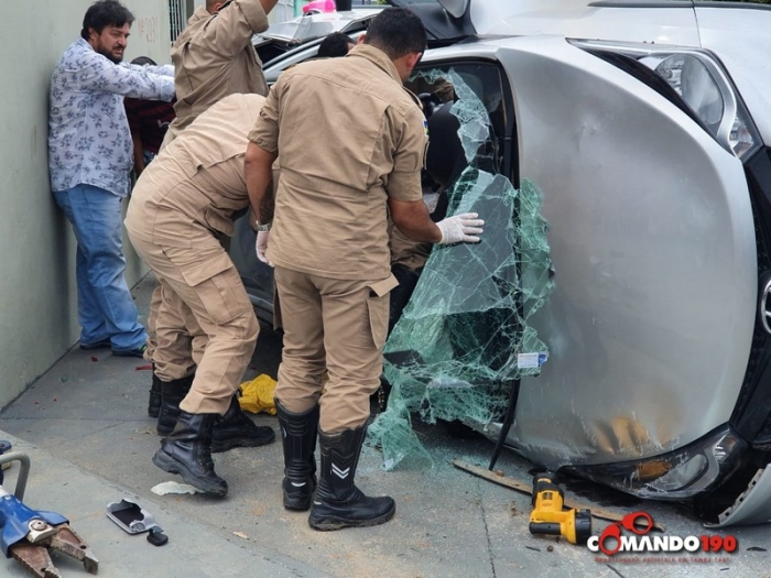 O veículo HB20 capotou e se chocou com um muro de uma residência, deixando uma mulher presa nas ferragens.