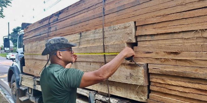 Uma equipe do Batalhão de Polícia Ambiental (BPA) apreendeu um caminhão carregado com madeira sem a documentação exigida por lei. A ação ocorreu na rua Pérola, bairro União II, em Ji-Paraná/RO, após denúncia de crime ambiental.