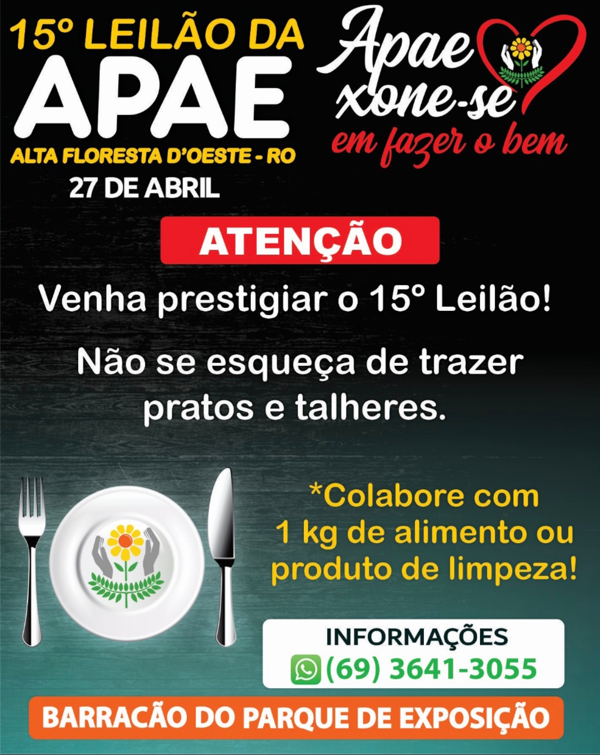 A presença da comunidade é essencial para o sucesso do leilão e para o fortalecimento das ações da APAE em Alta Floresta. Participe, colabore e faça parte desse movimento de solidariedade!