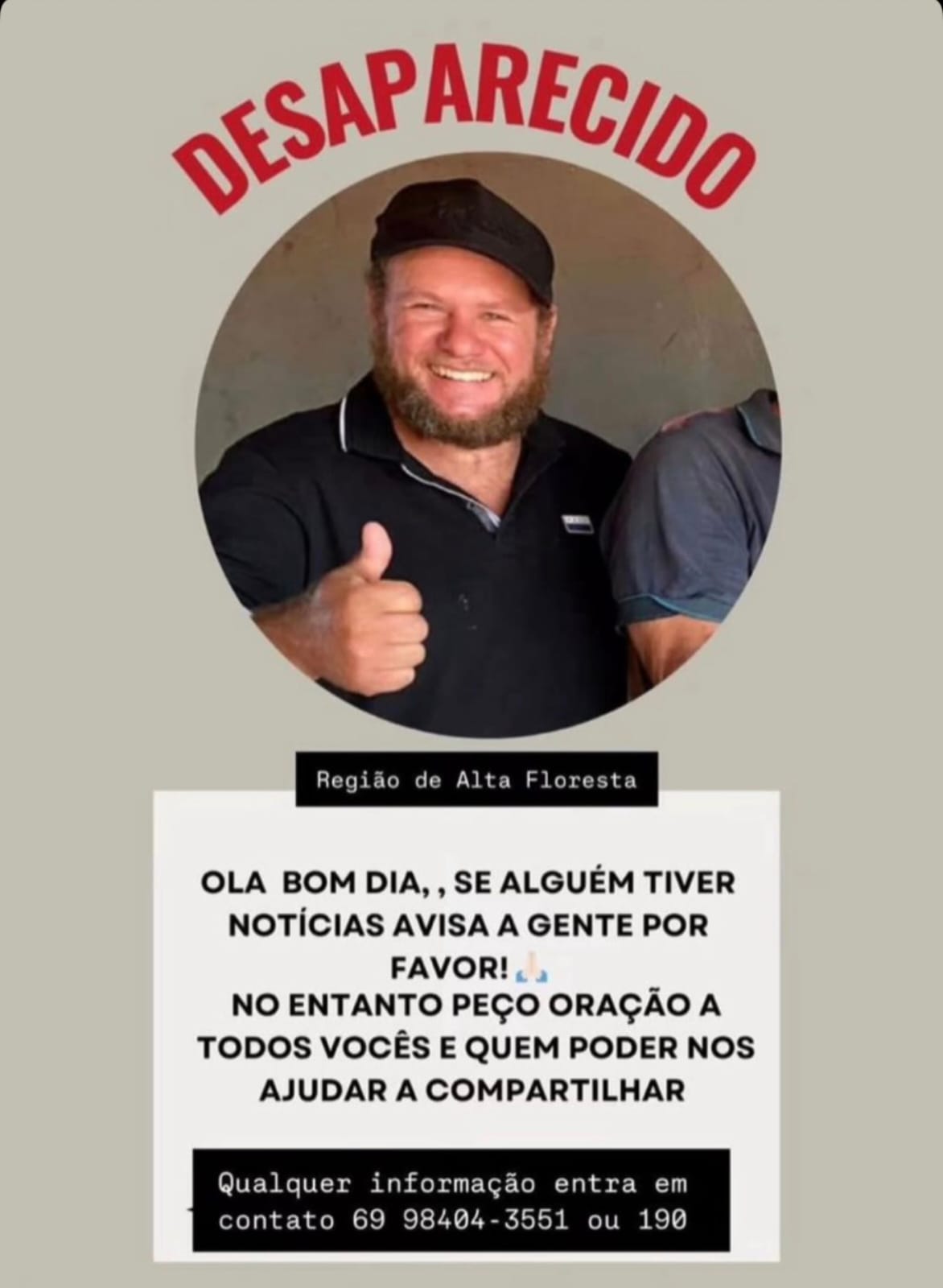 Familiares estão em busca de Cleber Campagnoni, que está desaparecido desde que foi visto pela última vez em sua propriedade rural, situada no distrito de Izidolândia, área pertencente ao município de Alta Floresta d´Oeste.
