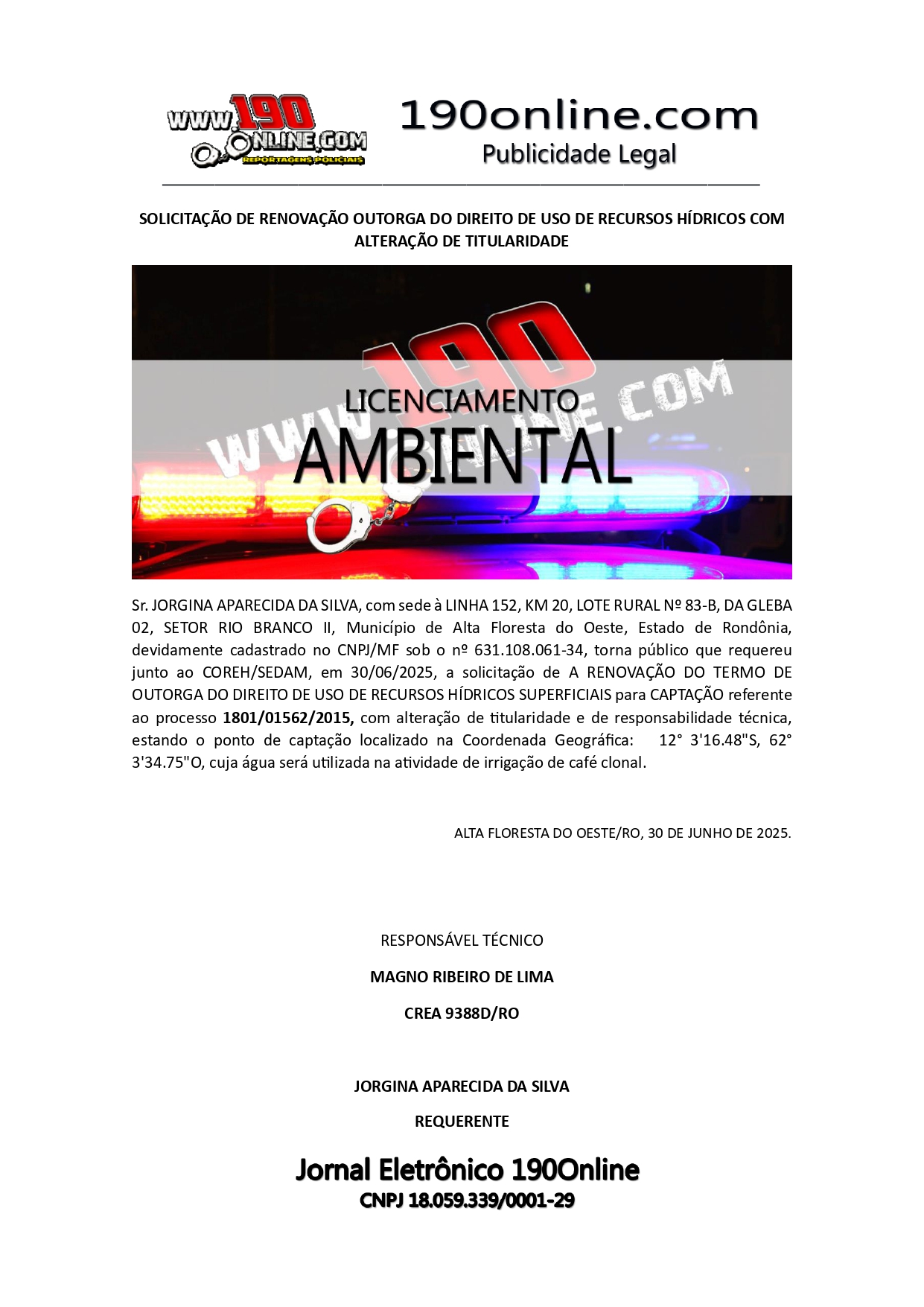SOLICITAÇÃO DE RENOVAÇÃO OUTORGA DO DIREITO DE USO DE RECURSOS HÍDRICOS COM ALTERAÇÃO DE TITULARIDADE DE JORGINA APARECIDA DA SILVA 190 Online 30 de junho de 2025 Publicações Legais