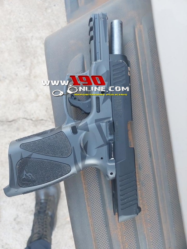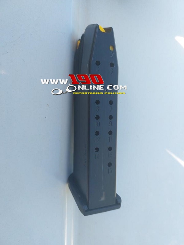 A Polícia Militar iniciou diligências e localizou o suspeito em uma residência próxima. Durante a tentativa de abordagem, o homem trancou-se em um cômodo da casa com sua mãe, recusando-se a se entregar e ameaçando atirar contra os policiais caso entrassem. Após a chegada de um advogado, o indivíduo se rendeu voluntariamente. Em vistoria ao local, os policiais encontraram uma pistola calibre 9mm, com 13 munições, escondida dentro de um ventilador.
