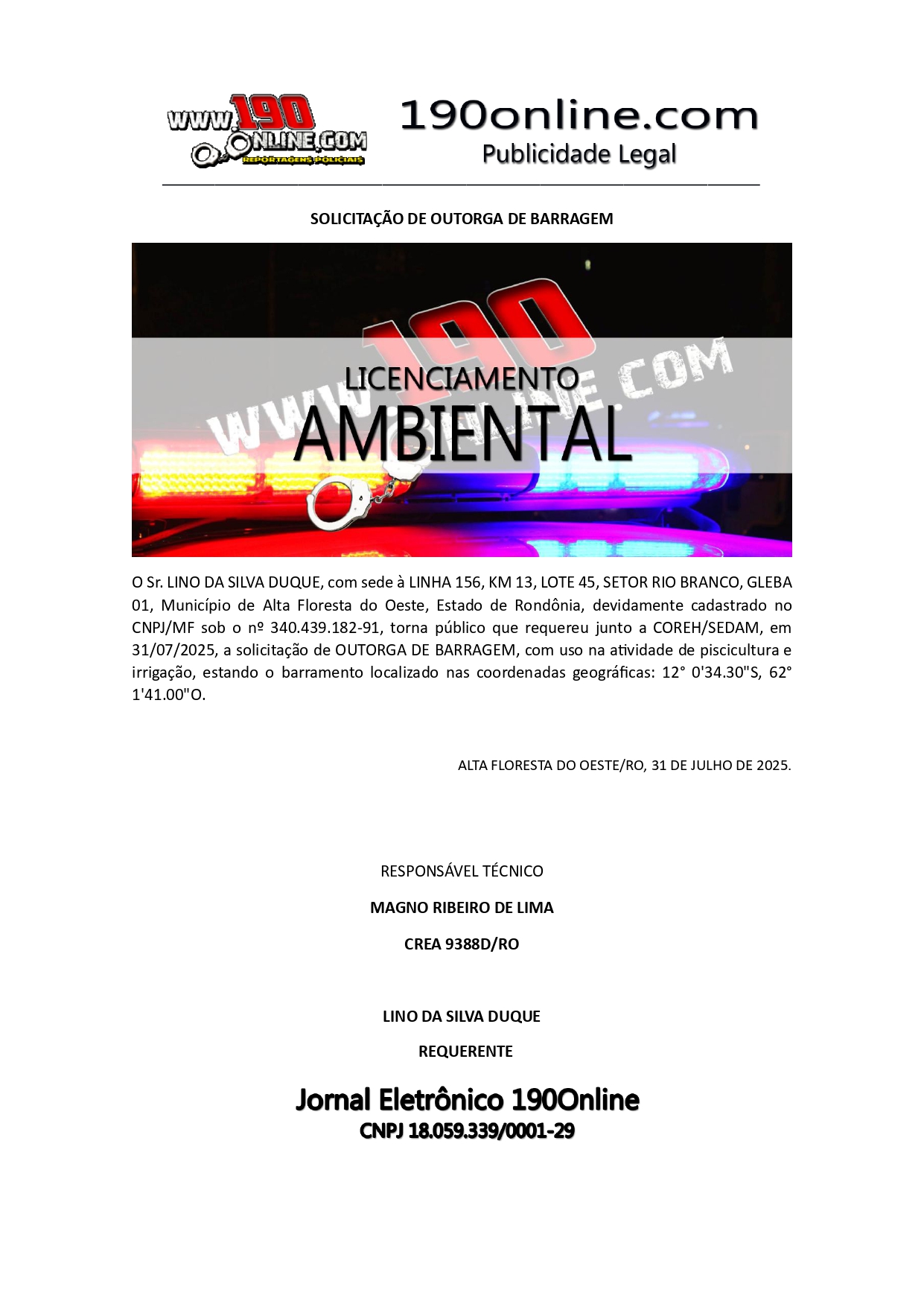 SOLICITAÇÃO DE OUTORGA DE BARRAGEM DE LINO DA SILVA DUQUE 190 Online 31 de julho de 2025 Publicações Legais