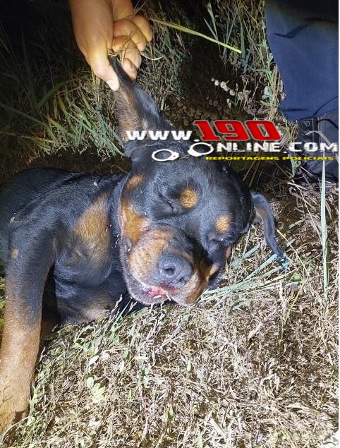 De acordo com informações, uma motocicleta Honda Bros colidiu contra um cachorro da raça Rottweiler que se encontrava no meio da pista. Com o impacto, o condutor e a passageira caíram ao solo, sofrendo ferimentos.