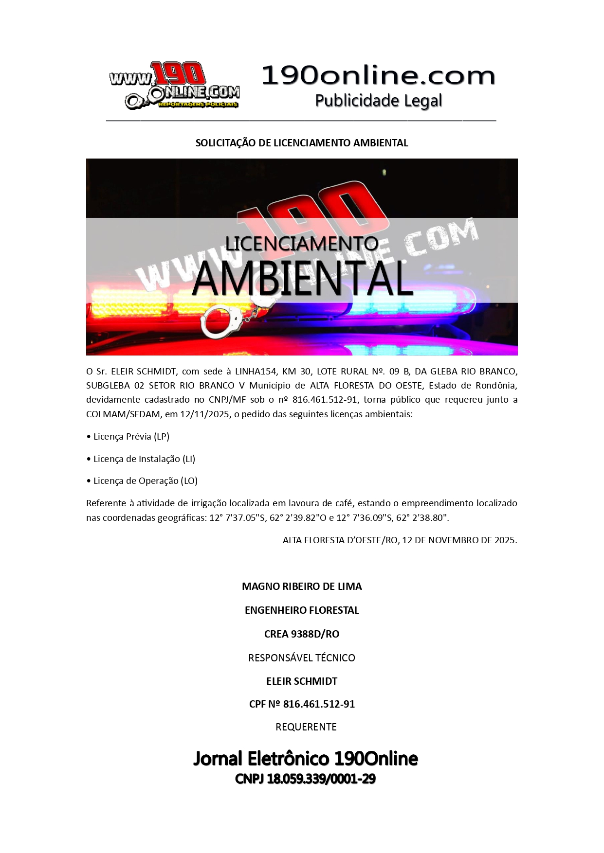 SOLICITAÇÃO DE LICENCIAMENTO AMBIENTAL DE ELEIR SCHMIDT 190 Online 12 de novembro de 2025 Publicações Legais