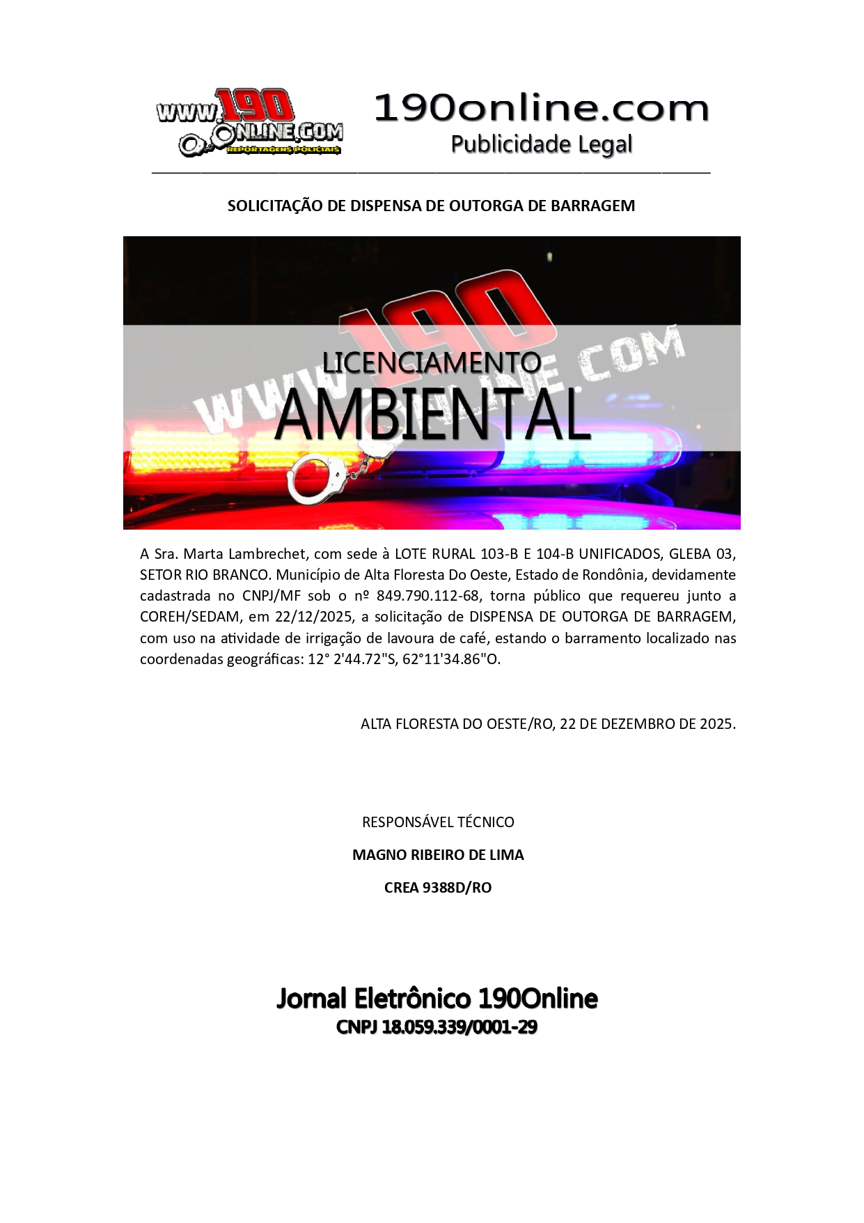 SOLICITAÇÃO DE DISPENSA DE OUTORGA DE BARRAGEM DE MARTA LAMBRECHET 190 Online 6 de janeiro de 2026 Publicações Legais